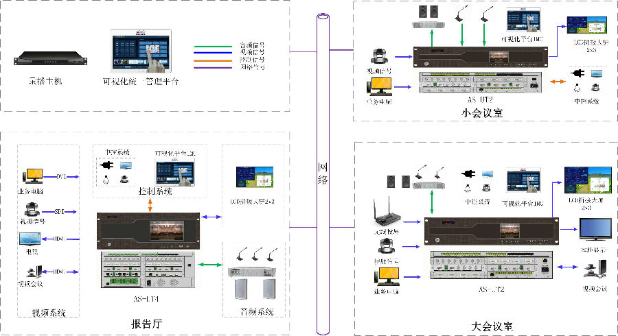多种信号同步接入,音视频信号统一管控。中控、音频、视频一体化可视化应用,部署方便、使用灵活、维护简单。