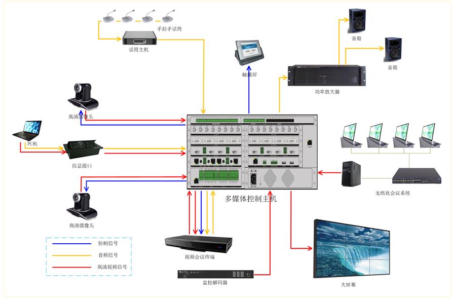 2、多媒体控制系统:采用华体会体育科技生产的多媒体会议室核心设备----多媒体控制主机,集高清混合矩阵、数字音频处理器、集中控制主机、高清录播服务器于一体。